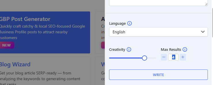 Finally, select the language (over 33), creativity level (1 to 5), and number of results. (up to 6). Then click Write to generate the post.