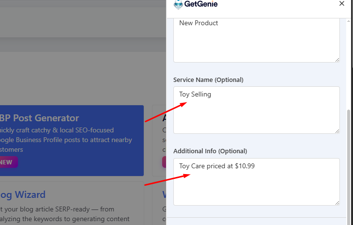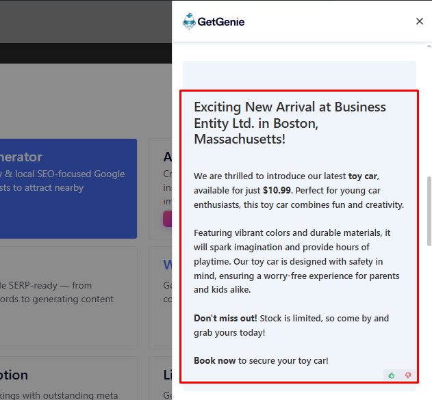 To help you write compelling posts and CTAs in GBP posts, you can use tools like Holen Sie sich Genie. GetGenie helps you generate powerful posts within the WordPress dashboard with its GBP Post Generator, and use the post content for your GBP post.