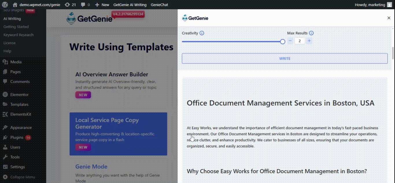 GetGenie is both a WordPress plugin and SaaS tool. So users can find, install, activate, and start using this AI content creation and SEO tool via: