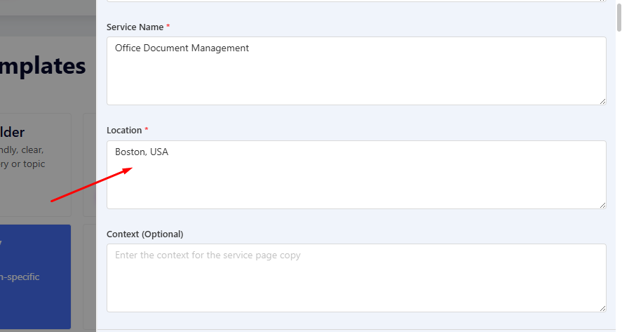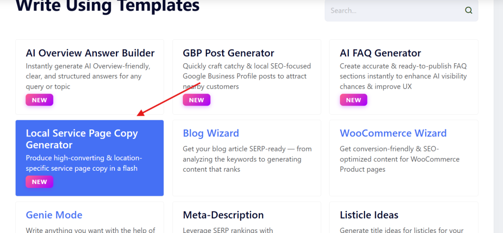 When you enter AI writing window, you’ll see a list of templates. From there, pick Local Service Page Copy Generator.