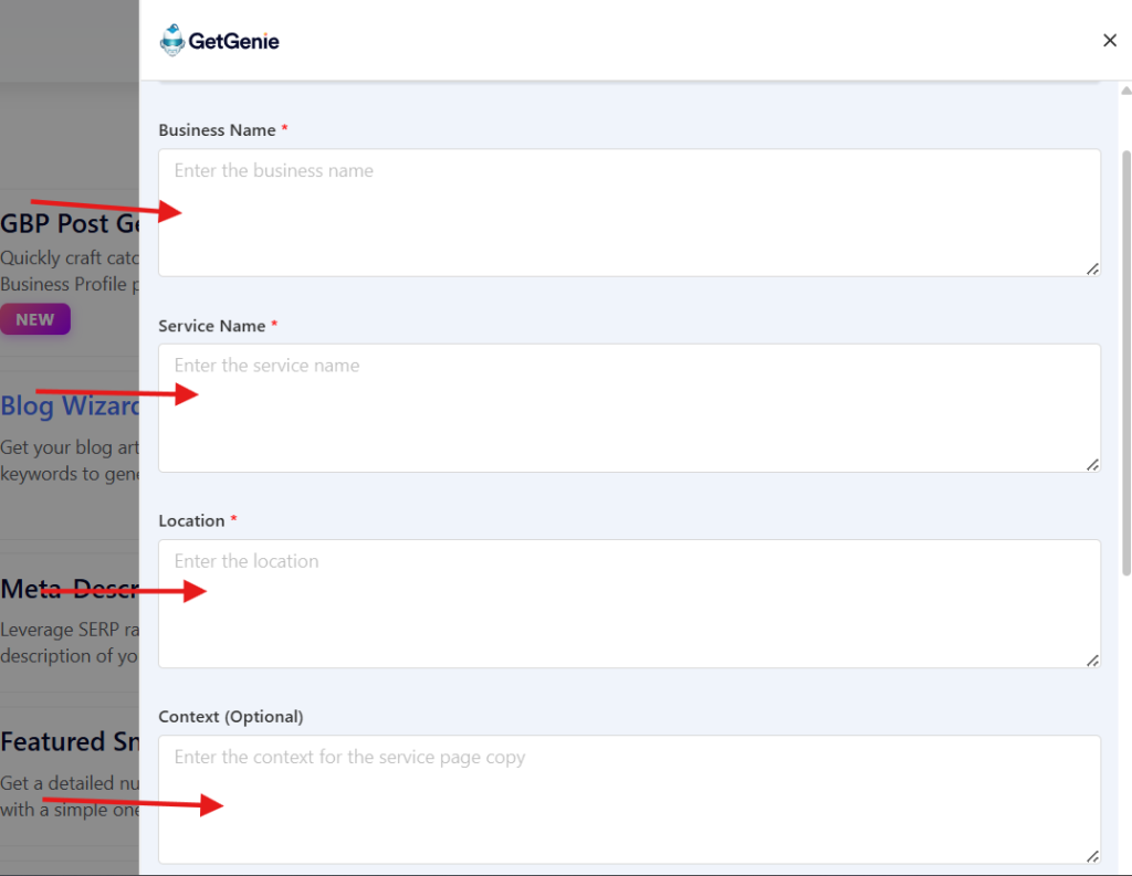 Following are the steps to generate Local Service Page Copy using GetGenie.
