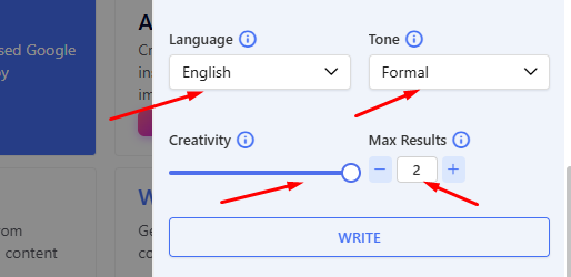 Before clicking Write to generate the answers, you can set the output creativity from 1 to 5. And the number of results anything between 1 to 6.