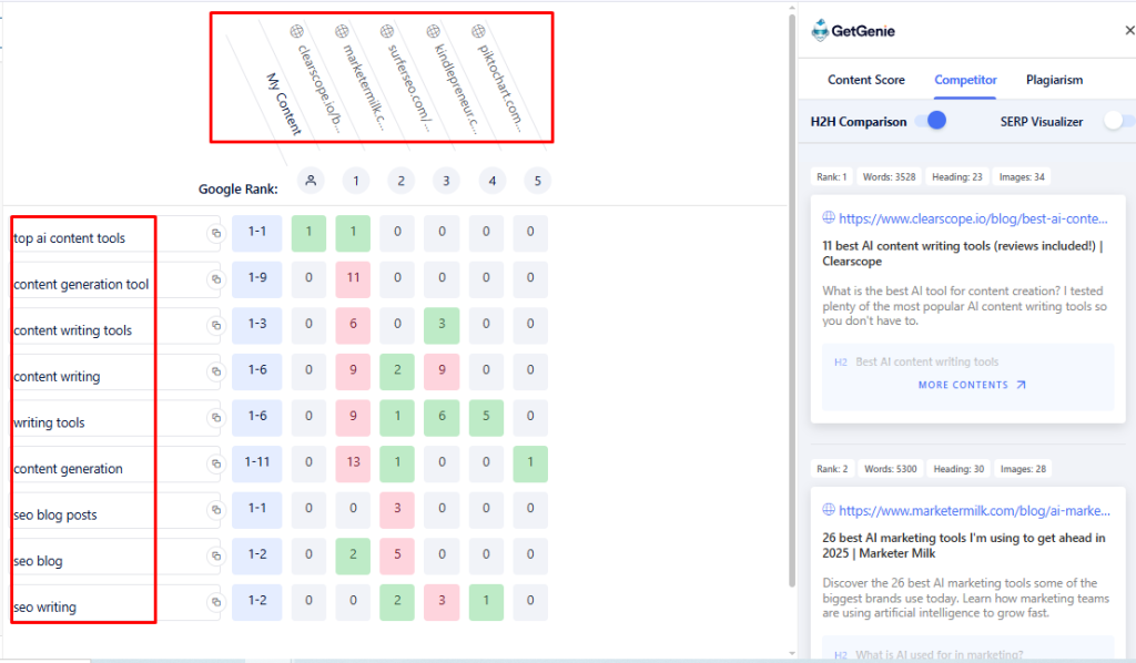 Going back to the keyword “Top AI Content Tools”, you can write “Comprehensive Guide for Top 25 AI Tools” instead of what the competitors wrote above, as shown by GetGenie H2H Analyzer.