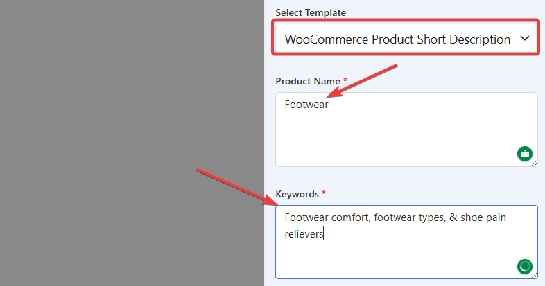 Just like the long description, start by entering the product name and target keywords to keep the copy relevant and optimized.