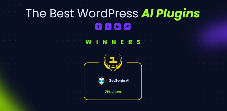 GetGenie won the top spot as Best WordPress AI Plugin in this Monster’s Award 2025. It raced past other competitors in the list, receiving a whopping 71% of votes.