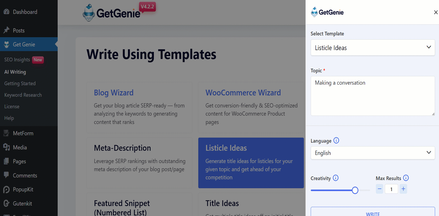 Du kommer att se den tidigare panelen här. Sätt ditt sammanhang, sätt gräns för kreativitet och produktion. Klicka på knappen Skriv. Du hittar din kopia skriven av GetGenie AI.