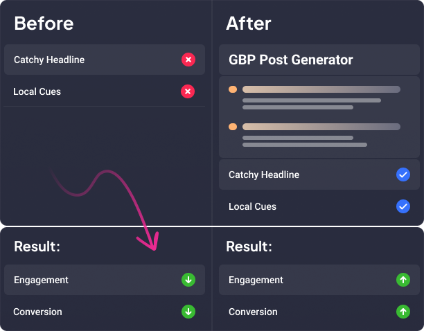 Publish conversion-friendly GBP posts to set yourself apart from the crowd. Generate high-engagement Google Business Profile posts that enhance your Google Map & Local Pack Visibility.